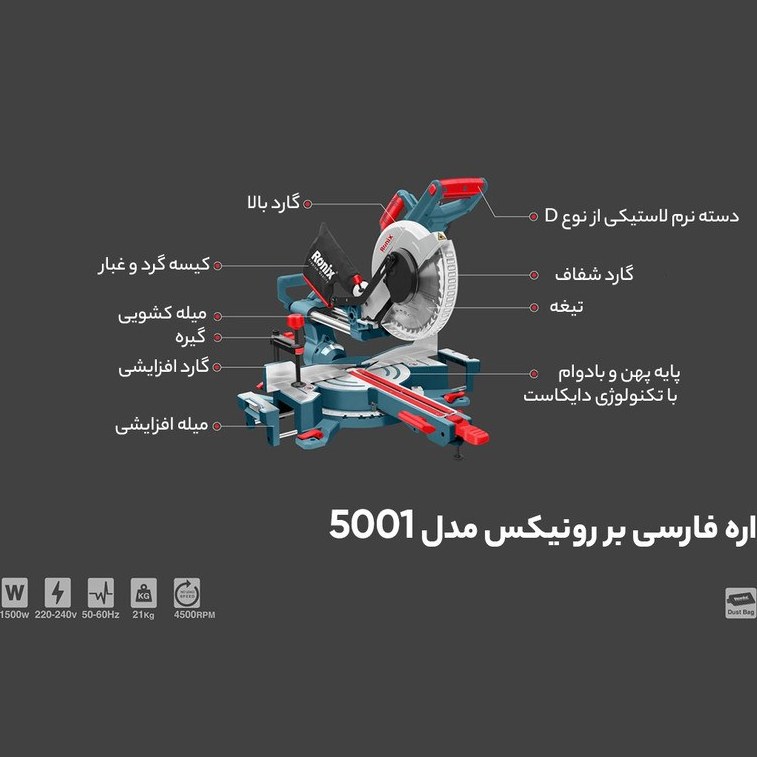 _ ارائهشده در جعبه رنگی رونیکس همراه با گونیای متحرک، واشر، گیره، آچار آلن، یک عدد تیغه برشی TCG؛ کیسه جمعآوری غبار